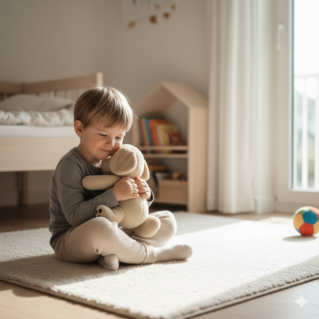 La peluche lestée apporte une sensation de stabilité qui favorise la concentration et les moments de calme. L’enfant se sent ancré, rassuré et plus disponible pour apprendre
